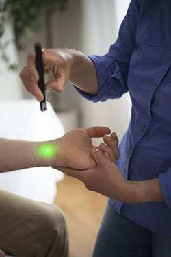 Durch Bestrahlung mit Licht besteht die Möglichkeit störende Narben, akute und chronische Entzündungen, Wundheilungsstörungen oder auch Akupunkturpunkte berührungsfrei zu behandeln. Dies ist besonders für Kinder oder Menschen mit Spritzenphobie geeignet. Das entsprechend angewandte Licht wird vor der Behandlung mittels KINESIOLOGIE ausgetestet. So kommt verschieden farbiges Licht, Farbbrillen oder auch ein Grünlichtlaser zum Einsatz.